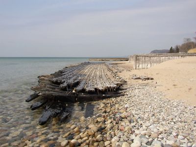 In the surf of Lake Michigan at the southwest corner of Camp Arcadia are the remains of the hull of the Minnehaha, one of the largest sailing ships on the Great Lakes. The Minnehaha was a 4-masted, 200 foot, wooden schooner carrying 823 gross tons and 782 net tons.